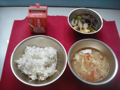 今日は夏野菜を使った献立でピーマンの入った焼肉と,トマトと卵のスープでした。