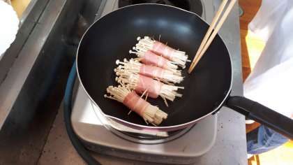 実際に焼いていくと香ばしいとてもいい匂いが漂ってきました。焼きめもついておいしそうなベーコン巻きに。早く食べたいという声もちらほら聞こえてきました。