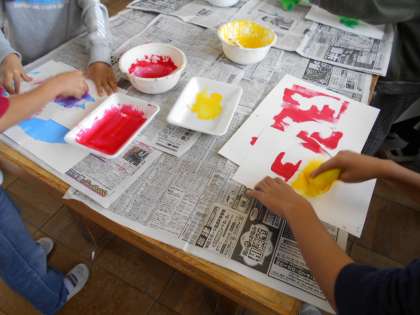 紙を好きな形に切って,できた型紙を使って,ローラーやスポンジで色付けをしました。型紙の置き方を考えながら,楽しんでうつしていました。