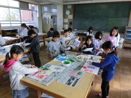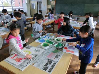 図画工作科で版画を楽しんでいます。型紙を作り,型紙の使い方や置き方などを考えてていねいにインクをのせました。ローラーやスポンジでインクをのせた後は,さあ,どうなっているか……。わくわくどきどきしながら型紙を外します。それぞれが思い思いに色を選んで楽しんで活動しました。