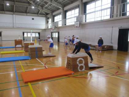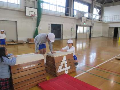 体育の学習では,跳び箱運動に取り組んでいます。自分のめあてに合った高さを選んだり,いろいろな跳び方に挑戦したりして頑張っています。
