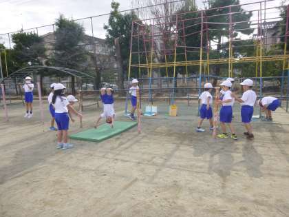 鉄棒となわとびの学習をしています。
