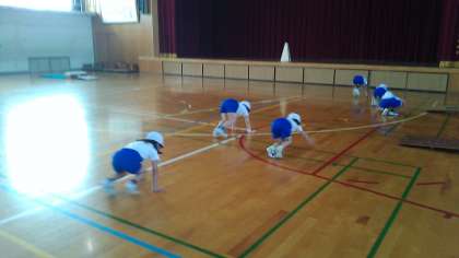 まずは,カエルジャンプなど,跳び箱の動きにつながる準備運動し,体を温めました。