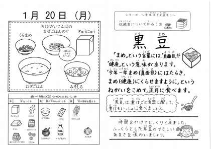 黒豆には,新しい1年を「まめ(真面目)にはたらき,まめ(健康)に暮らせますように。」という願いが込められています。