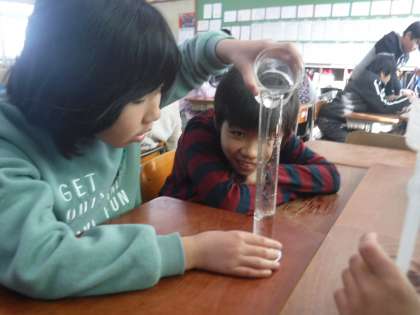 メスシリンダーの使い方を学習しました。交代しながら水の量を正確に,慎重に…。測り方がうまくなりましたね。