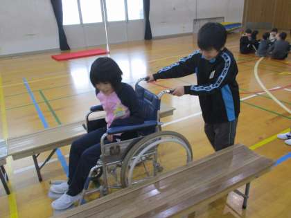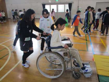 総合の学習で,車いすに乗る体験をしました。ちょっとした段差や障害物でも,車いすに乗る人にとって,大変なバリアになるということに気がつきました。