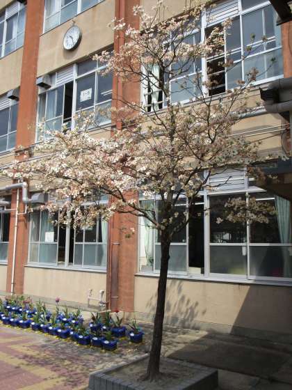 4年1組の下駄箱に近いハナミズキは,今,満開でとてもきれいです。