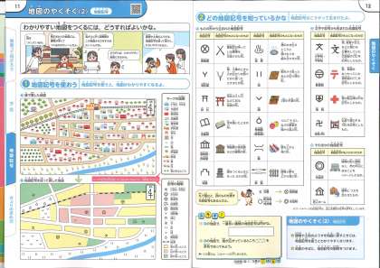 まちの様子を調べたら,それを「地図」にまとめていきます。そのときに役に立つのが地図記号。地図記号を使うと,地図がわかりやすくなります。