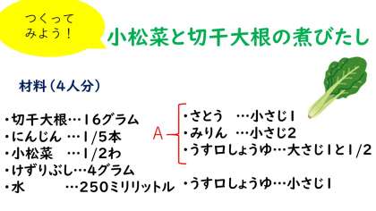 今日紹介する献立は,「小松菜と切干大根の煮つけ」です。