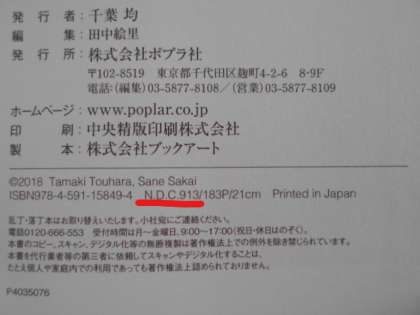 そのあとに続けて3桁の数字が書かれています。これが「分類記号」にあたり,ラベルの1段目の数字にあたります。この本の場合は,「N.D.C.913」とあるので,ラベルの1段目は「913」です。