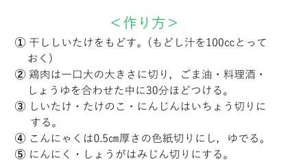 名前の通り,こんにゃくやうずら卵,しいたけなど,プリプリとした食感が楽しめ,ごはんにもよく合う一品です。