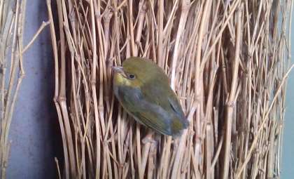 ピロティにメジロの子どもがいました。巣立ちをしたばっかりのようで,なかなかしっかりと飛ぶことができず,ちょっと飛んでピロティの屋根にとまったり,掃除のロッカーの横に立てかけてあった竹ぼうきにとまったりしていました。