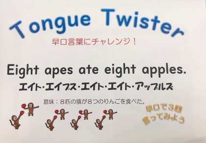 英語で「早口言葉」は,“Tongue twister”と言います。“Tongue”は「舌」,“Twister”は,日本語のツイストドーナツのイメージのように「ねじれる」という意味があります。英語の早口言葉は,発音練習や発音矯正や流暢さの向上に効果的です。集中して,チャレンジしてみましょう。