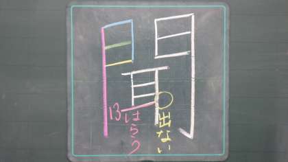 しゃしんのように,13かく目はよこに,はらいます。さらに,14かく目のたてのせんから13かく目が出ないように書きます。