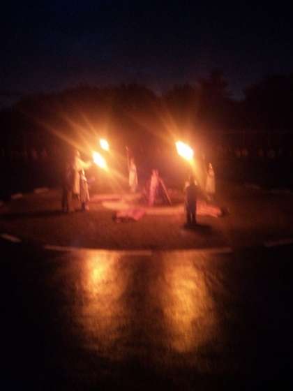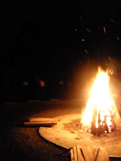 11日夜,キャンプファイヤーは屋外で行うことができました。火の神から火を授かり,大きな炎となり,夜空を明るく照らしました。