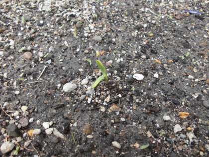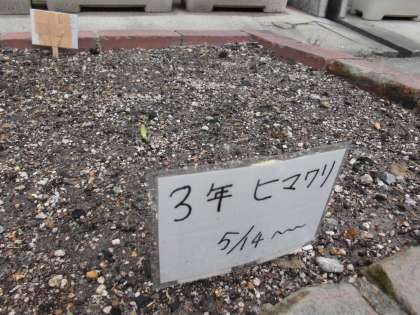 ヒマワリのたねをまいた花だんを見てみると,一つだけ“め”が出ていました。