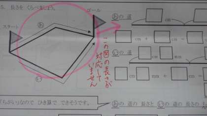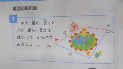 教科書P.44の絵を見て(下の写真),ものさしを使って長さを図り,問題に答えるようにしてください。