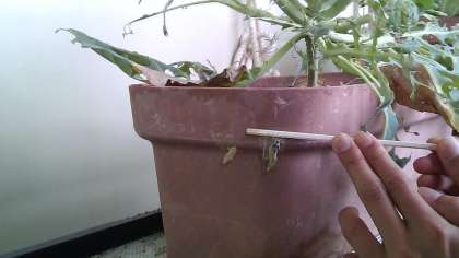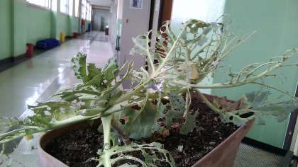 まだ,チョウになる前のさなぎがキャベツについています。