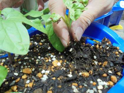 あまりげんきのないあさがおを4つえらんで,べつのうえきばちなどにうえます。