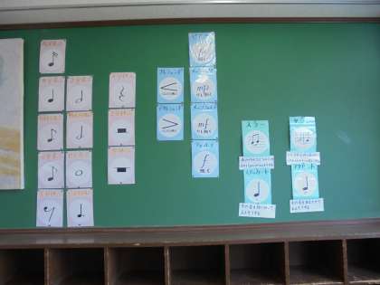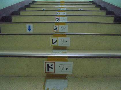 かいだんにもおんぷがかいてあります。がっこうにきたらみつけてください。