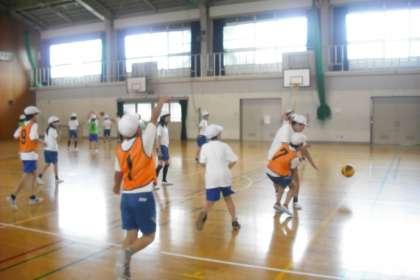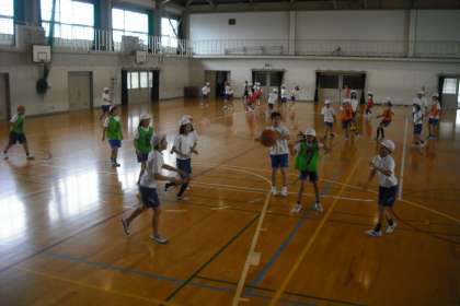 体育ではバスケットボールをしています。みんな必死にボールを追いかけ,ゴールを目指しています。一生懸命プレーする子どもたちは,とてもよい顔をしています。