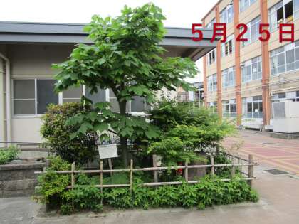 アオギリの木が成長し,大きな葉っぱをつけています。たった1ケ月でこんなに成長するのですね。