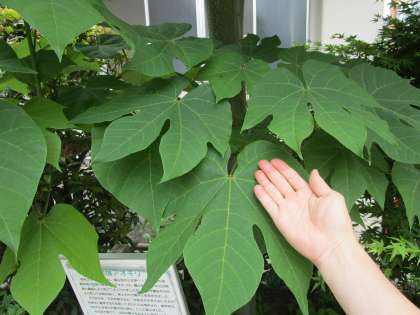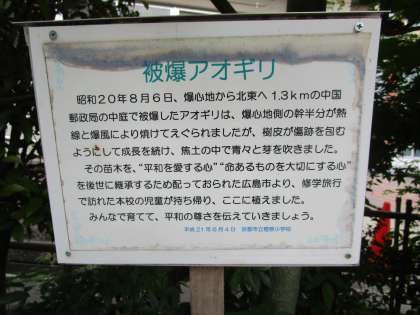 このアオギリは,約11年前(平成21年)に,6年生が広島から持ち帰り,ここに植えられた木です。