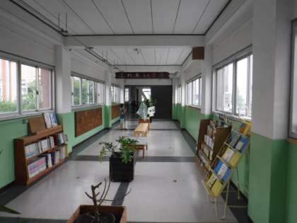 ほんかんと,きたこうしゃをつなぐ2かいのわたりろうかは,ふれあいひろばになっています。ふれあいひろばには,たくさんのほんがおいてあり,ベンチにすわってよむことができます。えいごのコーナーもあるのでぜひみにいってね!