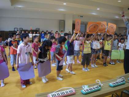 この日は,ミーティングルームで並び方の練習からしました。そのあと,歌や楽器の練習・ダンスの練習・言葉の練習もしました。