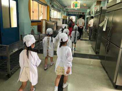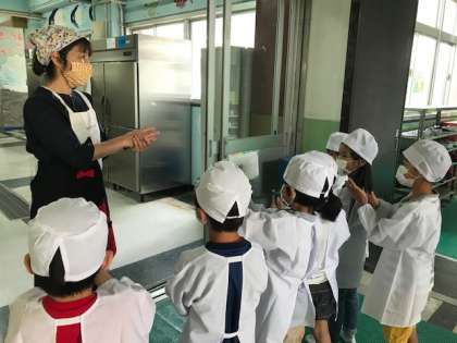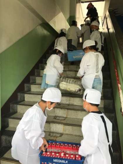 お当番の人は,上手に並んで給食室へ。給食室前で手のアルコール消毒をし,食器やおかず,ご飯などを運びます。階段も慎重に・・・。
