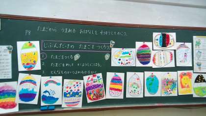 出来上がったたまごを黒板に並べると,本当にどのたまごからもお話が聞こえてきそうでした。次の時間は,たまごがわれて中からいろんなお話が飛び出します。