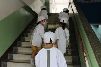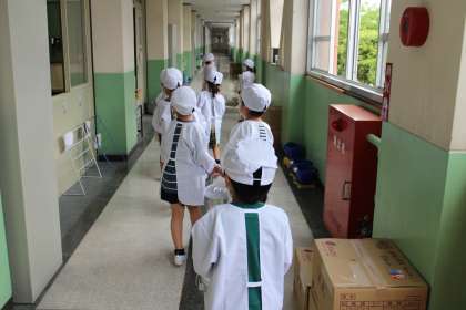 今週から始まった給食。給食当番も張り切ってやっています。友達と協力して,しっかりと食管を運んでいました。今は配膳はできませんが,片付けも,きちんと列になって歩くことができました。