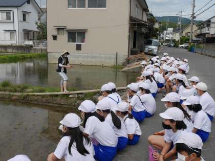 総合的な学習の時間に田植えをしました。いつも自分たちが食べているお米が,はじめはこんな小さな苗だったということに驚いている様子でした。これから,稲の成長を見守りながら,米作りに関わる方々の思いや,くふうについて詳しく調べていきます。