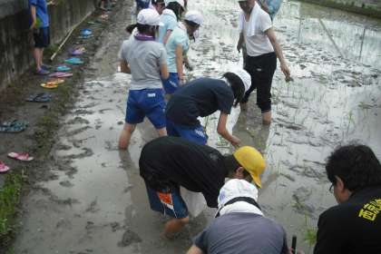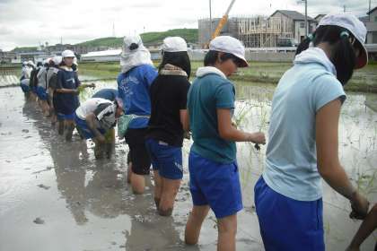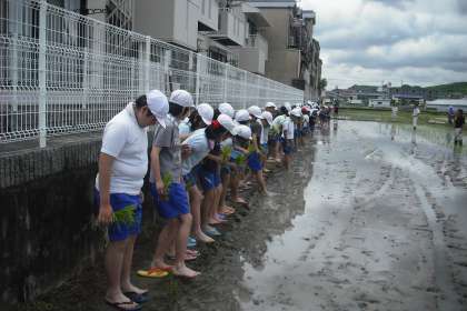 総合的な学習の時間に田植えをしました。田んぼに入るときには悲鳴とも言えるような声も聞こえてきましたが,子どもたちは一つ一つ丁寧に稲を植えていました。これからこの稲の生長を観察していきます。収穫のときが今から楽しみです。