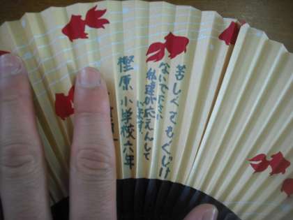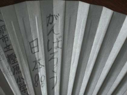 6年生が東北で被災した人達に向けてメッセージを扇子に書き込みました。東北では今でも避難所で暮らしている人や,一人一人に十分な食糧がいってなかったりと大変厳しい状況が続いています。6年生の思いを扇子にのせて温かいメッセージがたくさんありました。樫原校の6年生はこんなにも温かい心を持っていることを知らされました。