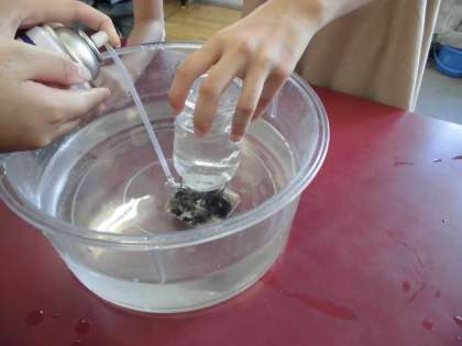 ちっ素の入ったびんに,火のついたろうそくを入れると,すぐに消えるので,実験が失敗したのかと心配になる子もいたほどです。