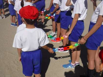 1年生との兄弟学年競技の練習をしました。「つながり」をテーマに6年生が考えた競技です。手をつなぐ代わりに「折り紙の輪」でつながって入場します。6年生が京の練習を覚えて,当日もやさしくリードできたらいいですね。