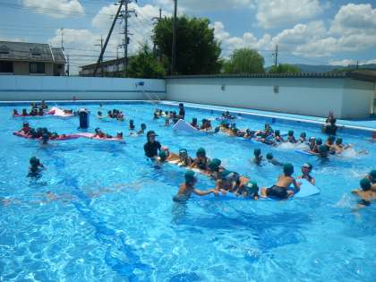 いろいろな浮き方の練習をしたり,泳いだり,宝さがしをしました。そして,最後には,大きなビート板を使ってみんなで楽しみました。