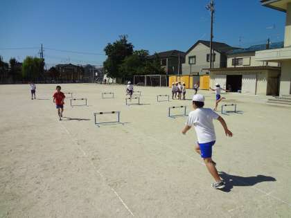 体育ではハードル走に入りました。飛び方・歩幅・インターバルの距離を確認しながら挑戦しています。目指せ世界陸上!!