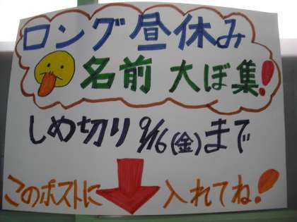 今日は計画委員から給食時に放送がありました。毎週水曜日のお昼休みの名前を募集します。っと放送がありました!今は,「ロング昼休み」と言っていますが,樫原の子どもらしいネーミングを楽しみにしています☆みなさん,職員室前にポストを用意してくれていますので,よろしくお願いします。
