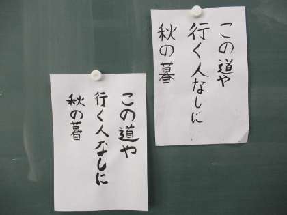 書写の学習では,小筆を使って,文字の大きさに気を付けながら松尾芭蕉の俳句を書きました。普段,自分の名前を書くことばかりが多い小筆ですが,大筆と同じように,点画のつながりに気をつけながら練習しました。みんな,ゆっくりと丁寧に書くことができました。