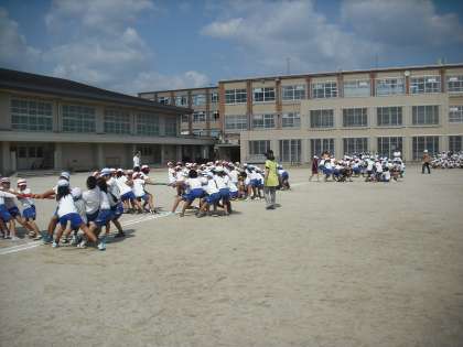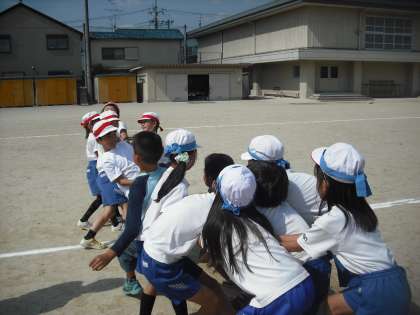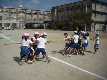 3年生と4年生の合同での競技は,「棒引き」です。今日は初めて棒引きをしました。笛の合図で棒をめがけて走ります!掴んだ棒を自軍の陣地に引きこみ,引き込んだ棒の数が多い組が勝ちになります。