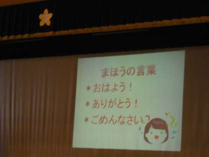 最初の,「おはよう」ですが,「おはよう」っと言ってくれる人がたくさん増えました。目が合うと「おはよう」っと言ってくれる人,こちらが「おはよう」と言う前に先に挨拶をしてくれる人などたくさん「おはよう」が聞こえています。すごく成長していると誉めてくださいました♪残りの二つもどんどん使えるようにがんばりましょうね☆