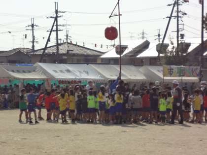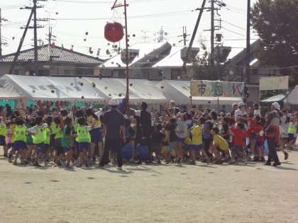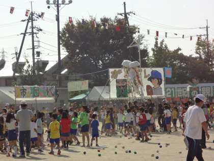 今日は区民運動会です。写真はくす玉割りの様子です。みんなくす玉めがけて投げています。