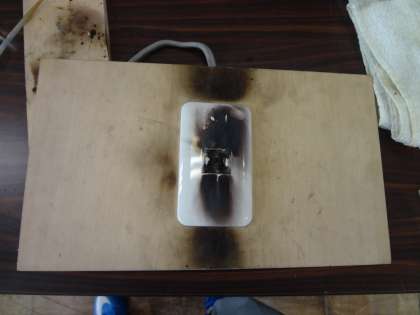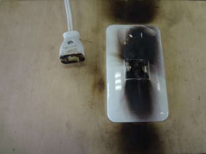 皆さんの家では,コンセントにプラグをさしっぱなしにしてませんか?さしっぱなしにすると,ほこりと湿気で急に火がつき火事の原因になります。1年に1回でいいのでプラグとコンセントを乾いた布で拭きましょう。火がつくと写真のようになります。