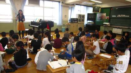 3年生は今日、音楽の授業で、音楽ホールで4年生にりコーダーを習いました。