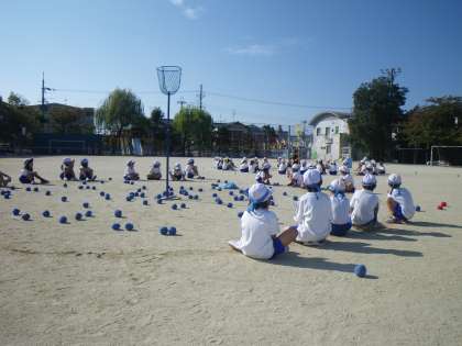 1年生の子どもたちは,かごをめざし真剣なまなざしで玉を投げていました。
