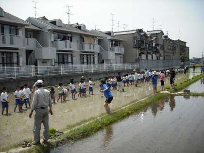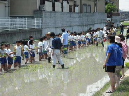 今年も、少年補導や地域PTAのご協力で行われる、お正月のお餅つき用のもち米の稲を5年生が植えました。地域の農家の田んぼをお借りして、代々続いている行事です。以前は、アイガモを雛から育てて、田んぼの雑草を食べさせ、その糞が肥料になるという有機農法を実践していたのですが、鳥インフルエンザ以降、中止になりました。とはいえ、田んぼに入って、稲を手で植えるという体験は、子どもたちにとっては大変新鮮で、驚きで、楽しかったようです。当日は、少年補導や地域・PTAの方々の協力を得て、ピンポイントで子どもたちのいるところへ稲の苗の束を投げてもらい、一直線に張られた紐の印のところへ、一つ一つ丁寧に植えていきました。秋には稲刈り。冬には餅つきや、注連縄をつくったりと、まだまだ取組は続きます。
