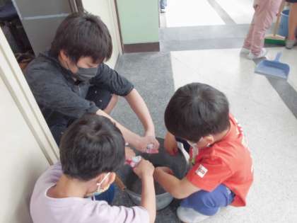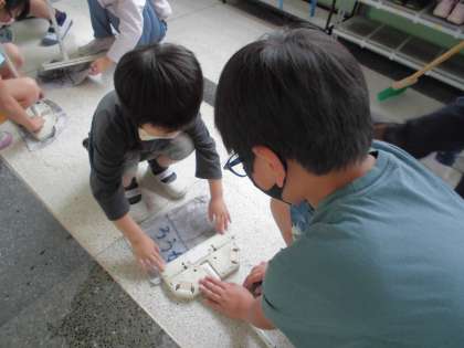 ほうきやワニモップの使い方などを6年生に教わりながら,一生懸命掃除に取り組む姿がみられました。