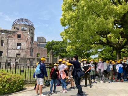 原爆ドームの前でクラス写真をとり、平和公園に向かいます。